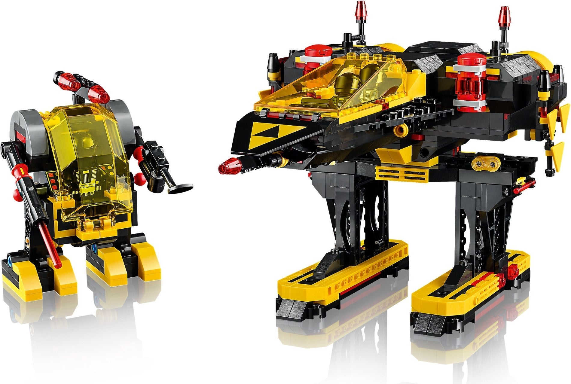 The asymmetric Blacktron Renegade spaceship is recreated in a modular design with new features, including a planet-rover drop pod, landing gear, 2 wing-mounted space speeders and 2 engine energy canisters. The model comes with 3 Blacktron minifigures and a droid figure, and it can be rebuilt, via online building instructions, into an enhanced version of the 1980s LEGO Alienator.
