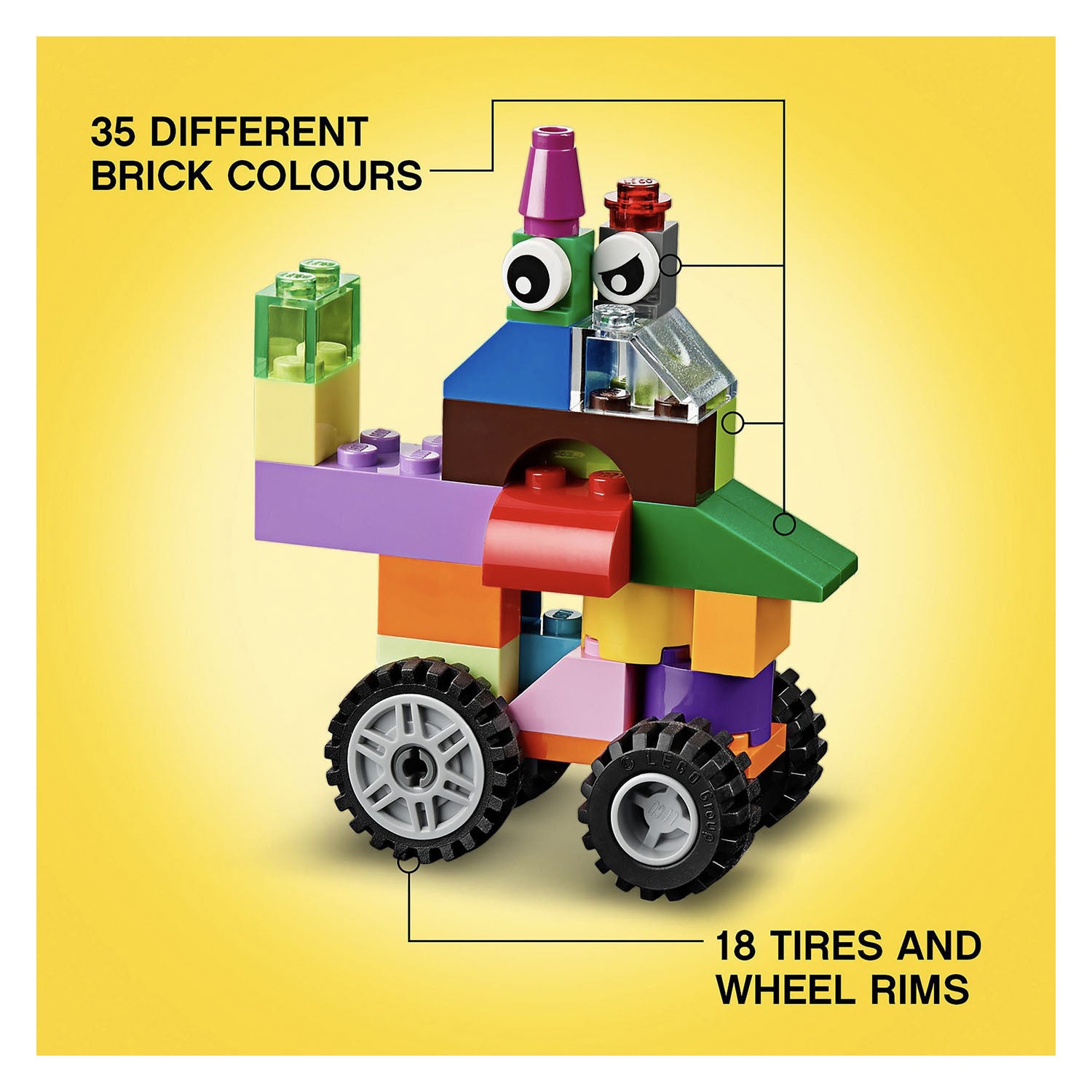 Designed with builders of all ages in mind, this collection of LEGO® bricks in 35 different colors will encourage open-ended building play, and inspire any imagination. Windows, eyes, and lots and lots of wheels add to the fun and offer endless possibilities for creative construction and vehicle play. A great supplement set to any existing LEGO collection, this set comes in a convenient plastic storage box and includes ideas to get the building started.