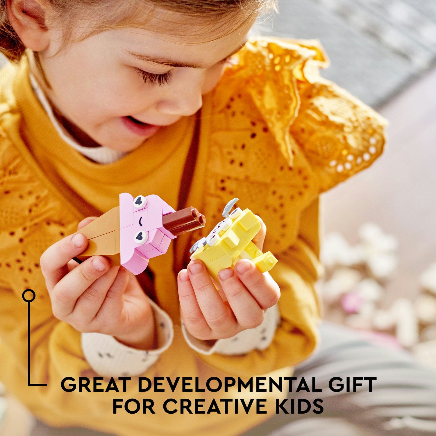 This creative construction kit contains 333 bricks in a range of shapes, sizes and pastel colors. 18 of the bricks feature expressive eyes that kids can use to bring their creations to life. Clear printed building instructions are included for 5 easy-to-assemble models: a cloud, an ice cream, a dinosaur, cat and a robot. As their creative confidence grows, kids can explore endless free-building fun. A digital version of the set’s building instructions can also be found within the LEGO Builder app.