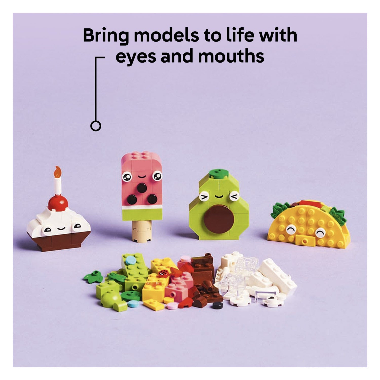 LEGO? Classic Creative Food Friends (11039) is a versatile building set for kids aged 4 and over. Featuring a range of fun food characters, this imaginative toy is ideal for pretend play. With endless opportunities to build, rebuild and explore free-building fun, this beginner?s LEGO set develops youngsters? confidence, concentration and problem-solving skills. Kids use the colourful and captivating assortment of building bricks and special pieces ? such as eyes, mouths and various decorative elements ? to build 4 cute Food Friend toys: a cupcake, ice cream, avocado and taco. The creative fun continues as kids mix the bricks to rebuild the models into a cake with sprinkles, bubble-tea drink, pear and a panini. As kids become more confident in their building skills, they can follow the intuitive building guide to change expressions, shapes or colours to create new Food Friends, including a green ice cream, juice carton, slice of watermelon, chocolate bar and a mega sandwich.