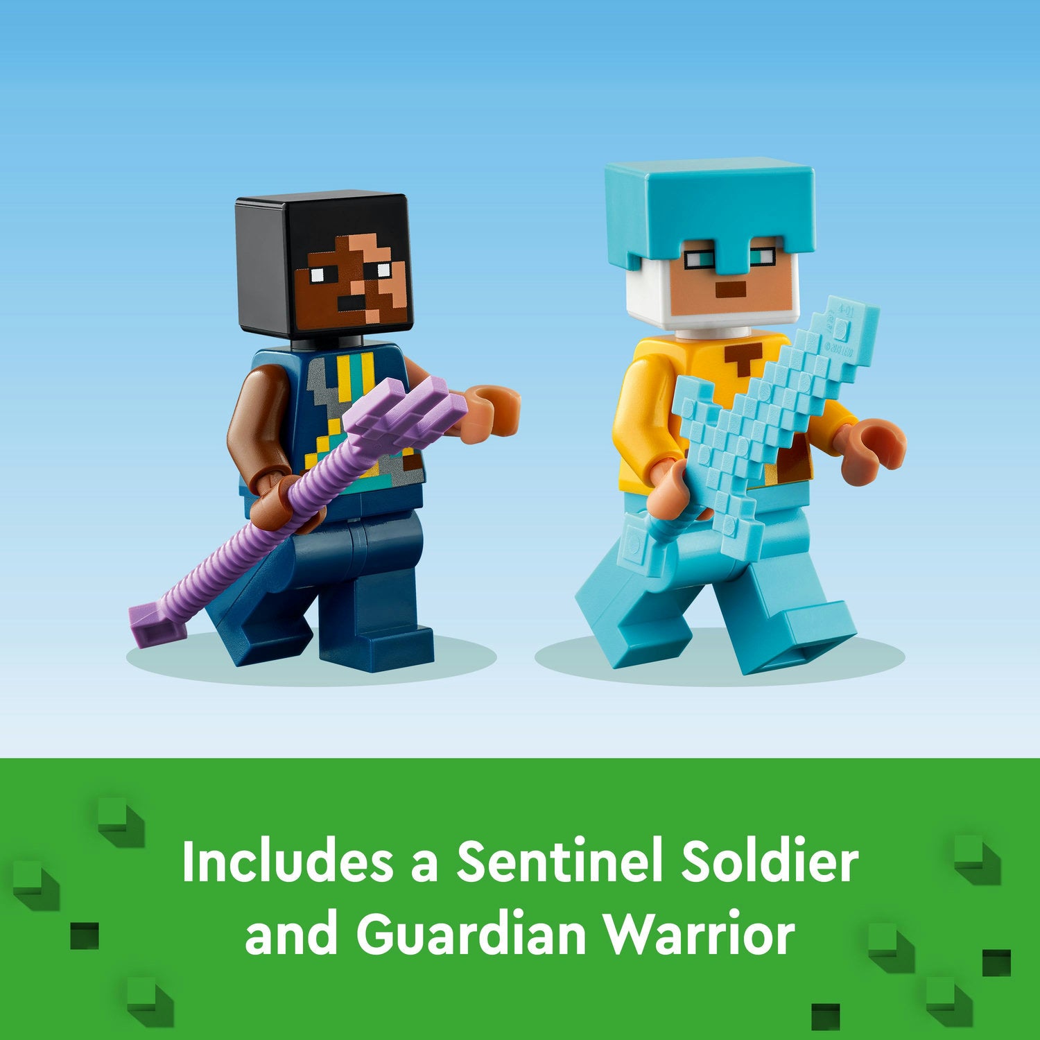 Kids build a giant diamond sword base into the side of a mountain and defend it against attacks by hostile mobs. The base includes a table, cookie and a jukebox on which they can ‘play’ a record. Outside, Sentinel Soldier and Guardian Warrior figures stand guard. Further firepower is provided by 2 shooters located at the front of the base. Hostile mobs include a Creeper™ and a skeleton. Friendly mobs include a pig and an allay, which features foil wings. A lever at the bottom of the tower triggers an explosion that collapses part of the structure. For added digital fun, the LEGO Builder app features intuitive zoom and rotate tools that let kids visualize their model as they build.