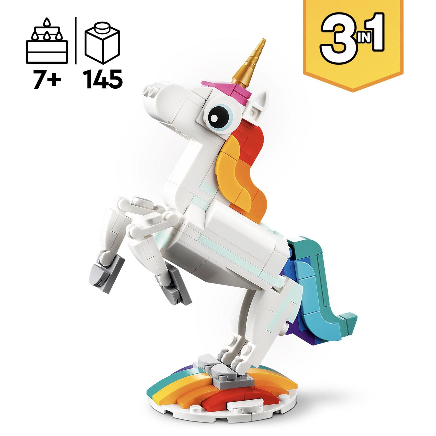 Imaginative kids aged 7+ can be transported to a mythical land for enthralling action with this 3in1 Magical Unicorn (31140) building set. It features a unicorn toy with a golden horn, colorful tail, and posable legs and hooves. It can be presented in 2 different positions: standing on 4 legs or reared up on its 2 hind legs for an iconic pose and displayed on the set’s rainbow stand.