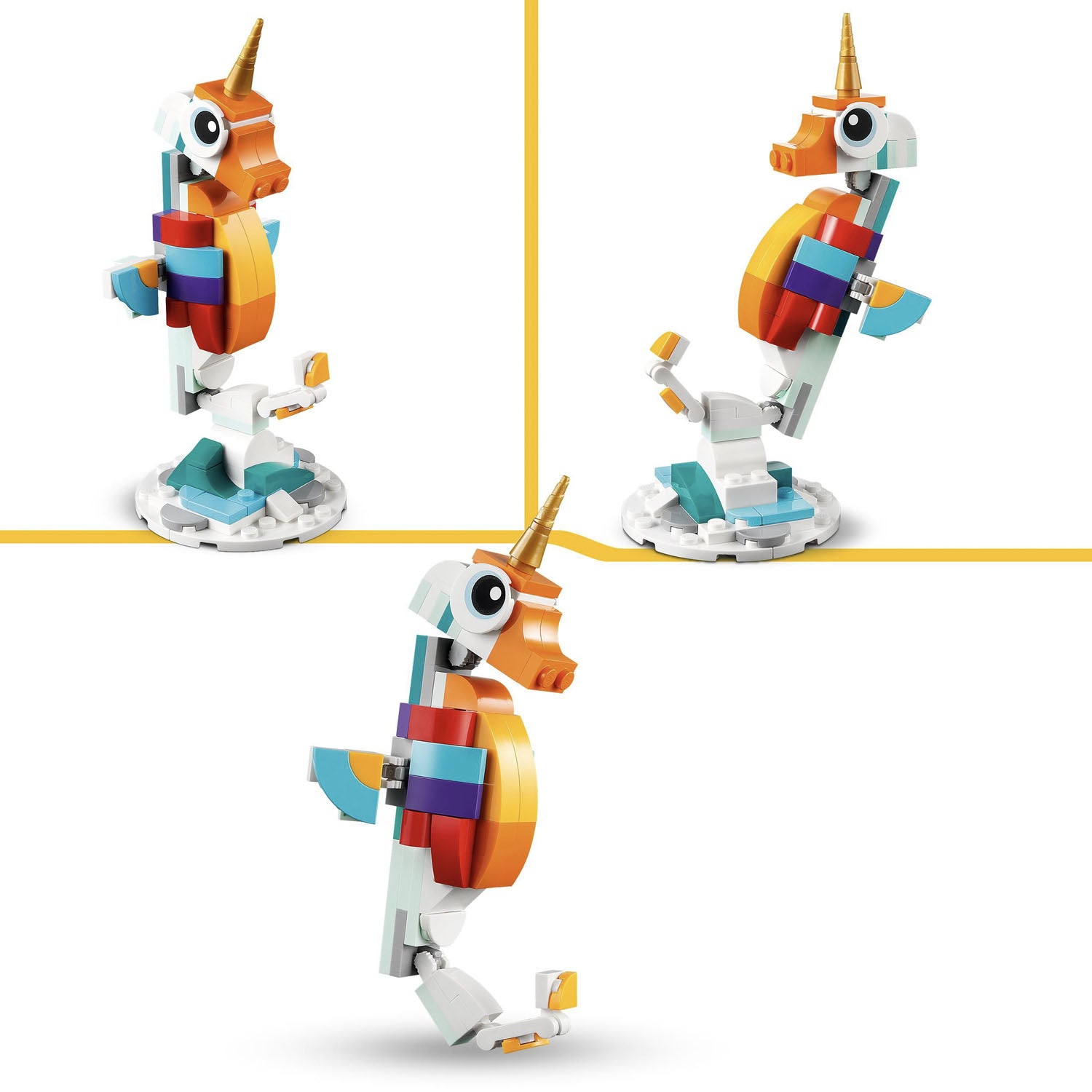 The mythical action never stops with 3 different magical creatures for little builders to assemble in this LEGO Creator 3in1 set. They can build a posable Magical Unicorn, rebuild it into a posable seahorse toy with a seabed stand, turn it into a posable magical peacock with a colorful tail, or even use the bricks to create another enchanting creature.