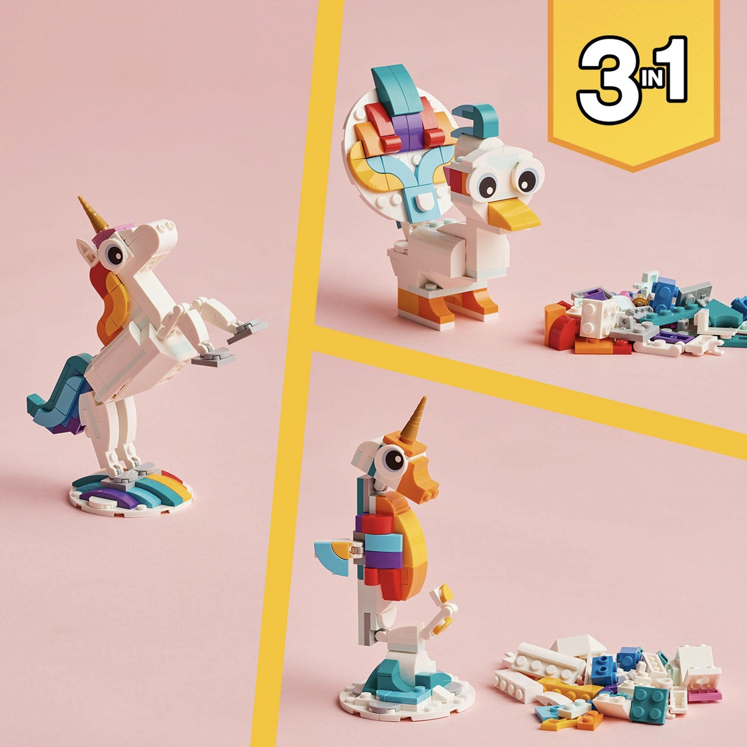 - 3 magical creatures in 1 set – Little builders can build and rebuild 3 different colorful models with this LEGO® Creator 3in1 Magical Unicorn (31140) playset