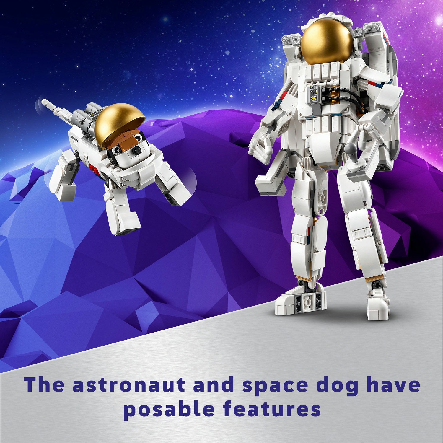 Boys and girls can build 3 different space playsets: a posable space astronaut, a futuristic space dog with posable legs and tail, or a space viper jet with a se at for a minifigure (not included) to pilot it. All 3 models make great space-themed creative gifts and come with stands for display.